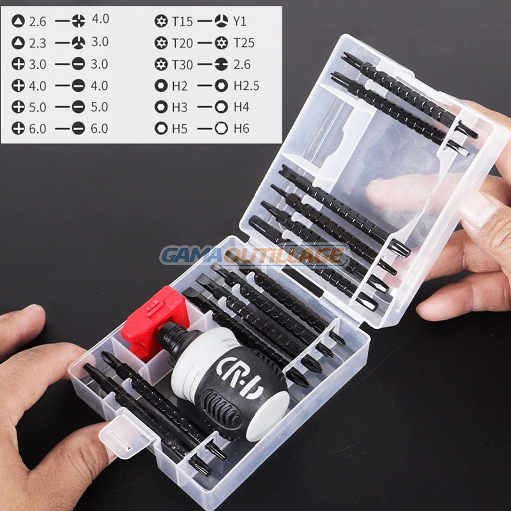 - Formes diverses Le jeu de tournevis multifonction à cliquet comprend un total de 26 pièces (types 24 bits, 1 aimant puissant, 1 poignée de tournevis), placées dans une boîte à outils.