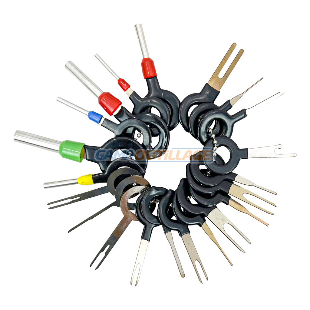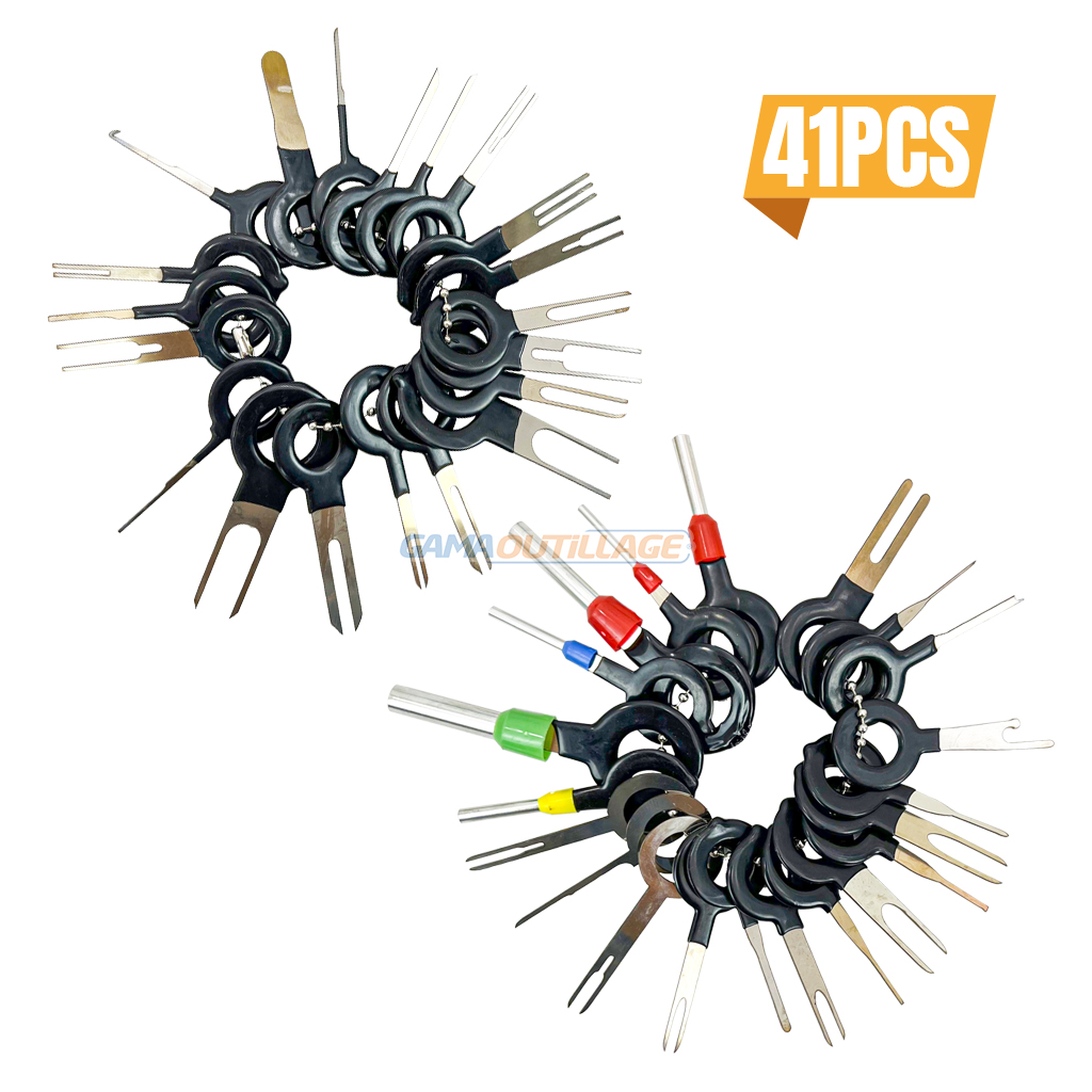 KIT DEMONTAGE FICHE AUTO 41PCS TA, Ce sont des outils conçus pour retirer les cosses ou les connecteurs des fils électriques, généralement utilisés pour réparer ou remplacer des composants électriques dans un véhicule. Ils sont souvent composés de différentes tailles et formes pour s’adapter à une variété de connecteurs.