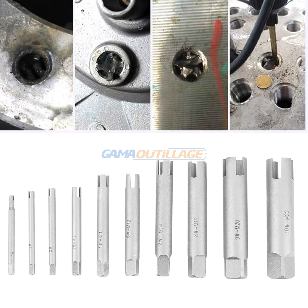 GAMAOUTILLAGE vous propose une KIT EXTRACTEUR DE TARAUD 10PCS, est un outil conçu pour retirer un taraud cassé à l’intérieur d’une pièce. Un taraud sert à créer des filetages (comme ceux des vis) dans un matériau. Si un taraud se brise pendant cette opération, l’extracteur permet de le retirer sans endommager la pièce.