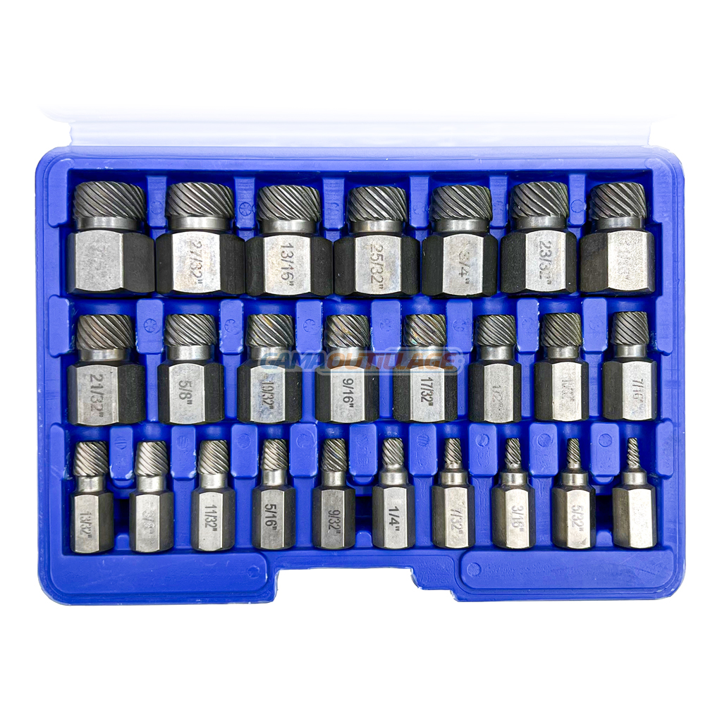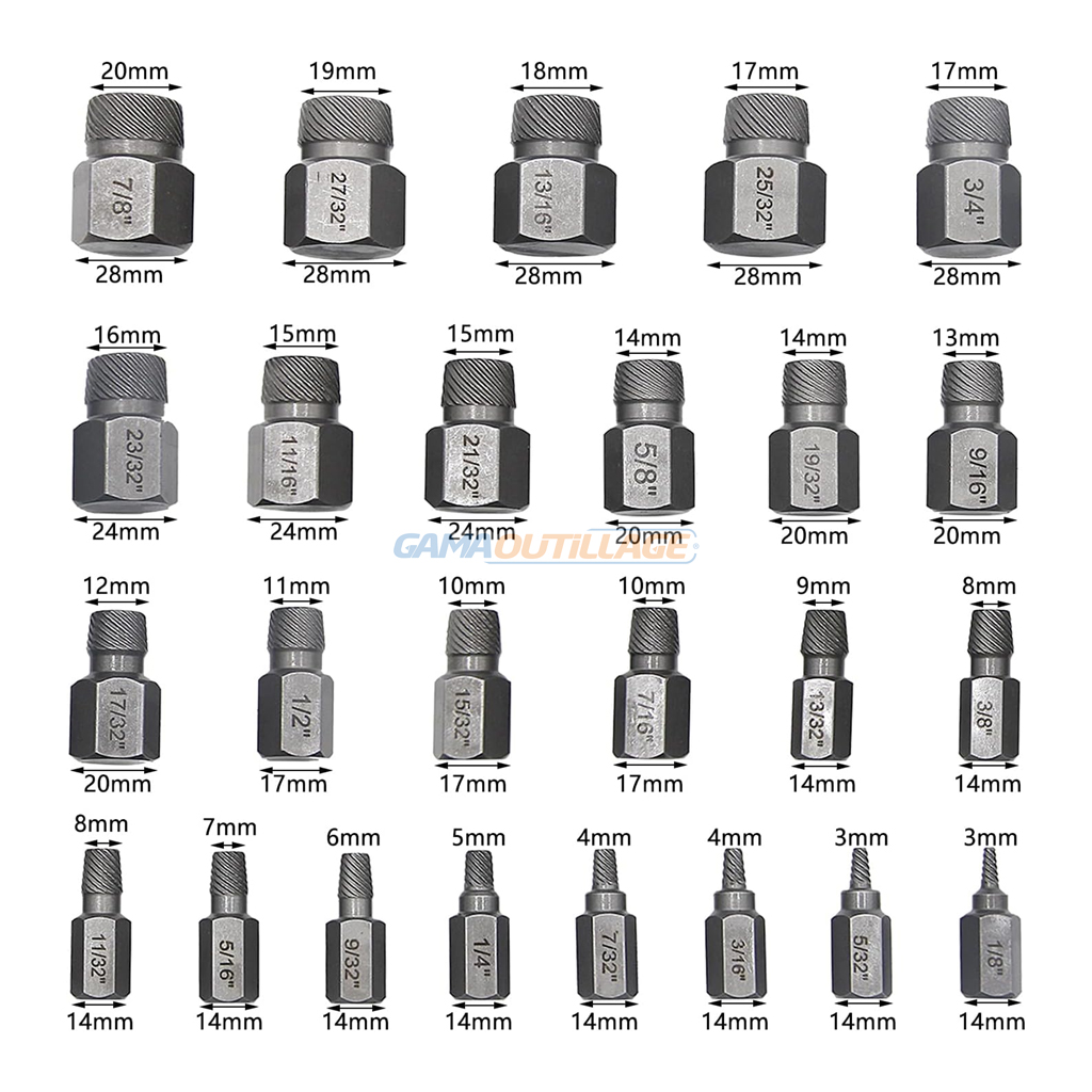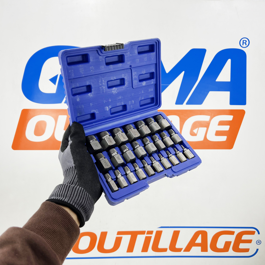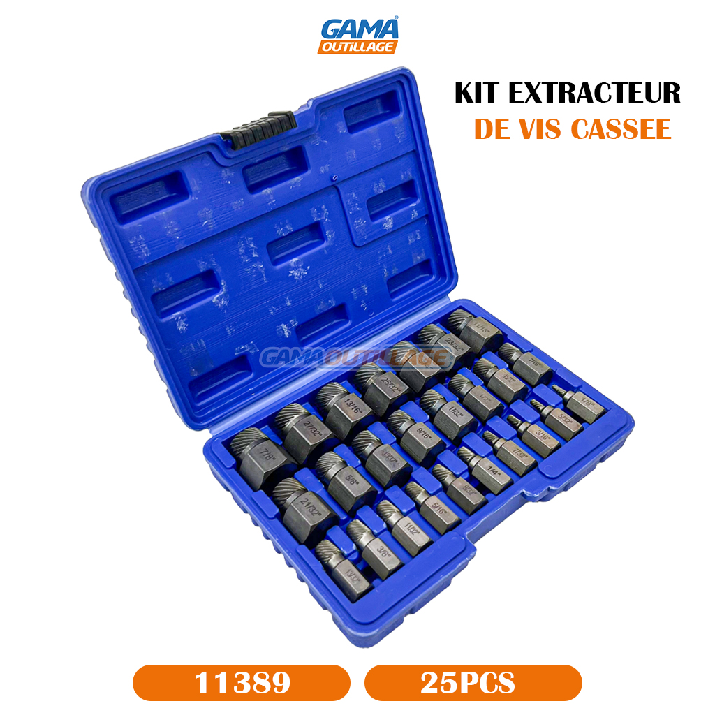 GAMAOUTILLAGE vous propose une KIT EXTRACTEUR DE VIS CASSEE 25PCS, est un outil conçu pour retirer les vis dont la tête est endommagée, cassée ou impossible à saisir avec un tournevis classique. Ils sont particulièrement utiles dans les situations où la vis est grippée, rouillée ou lorsque la tête est usée.