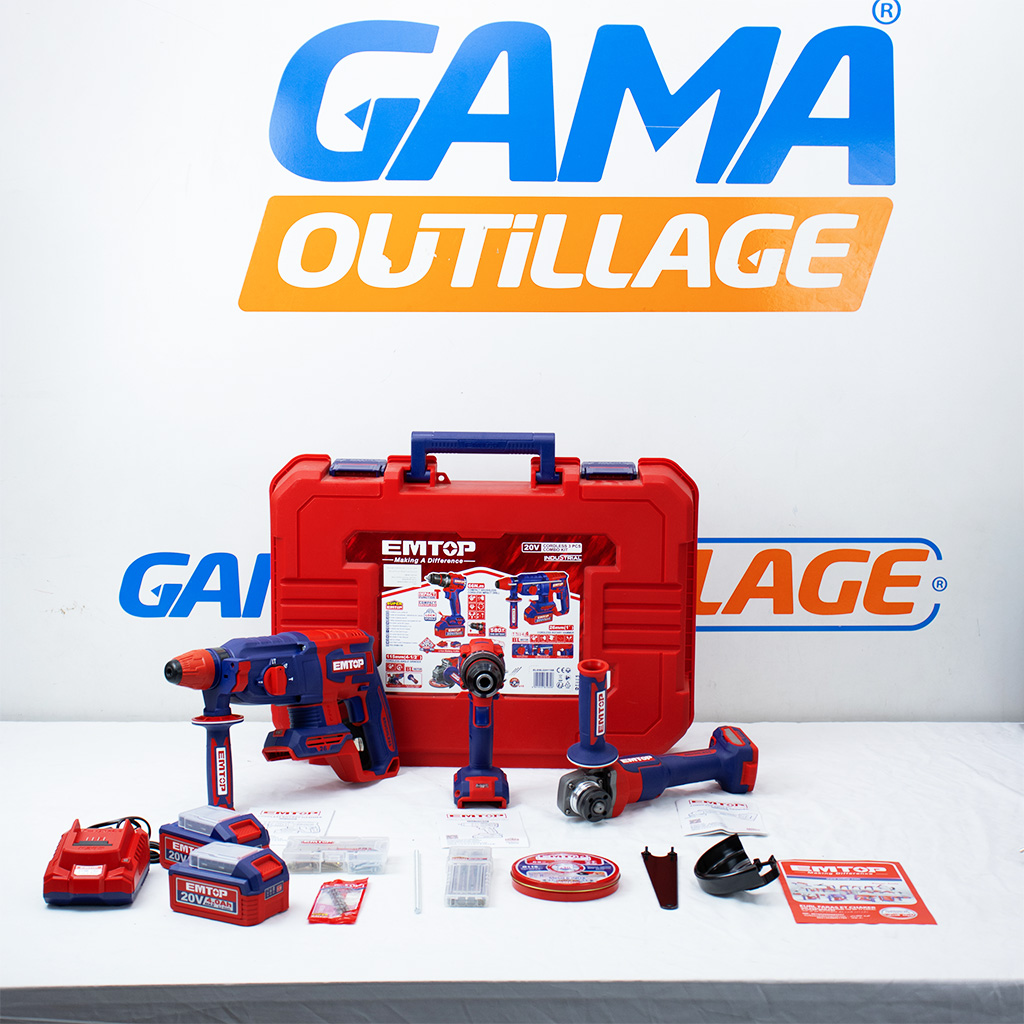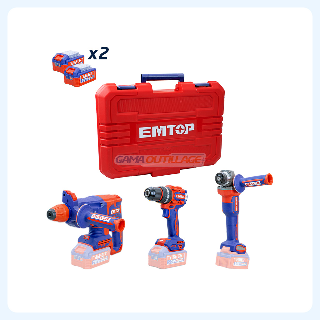 Kit outils sans fil EMTOP 20V comprenant perceuse visseuse, meuleuse d’angle et marteau perforateur, idéal pour travaux bois, métal et béton.