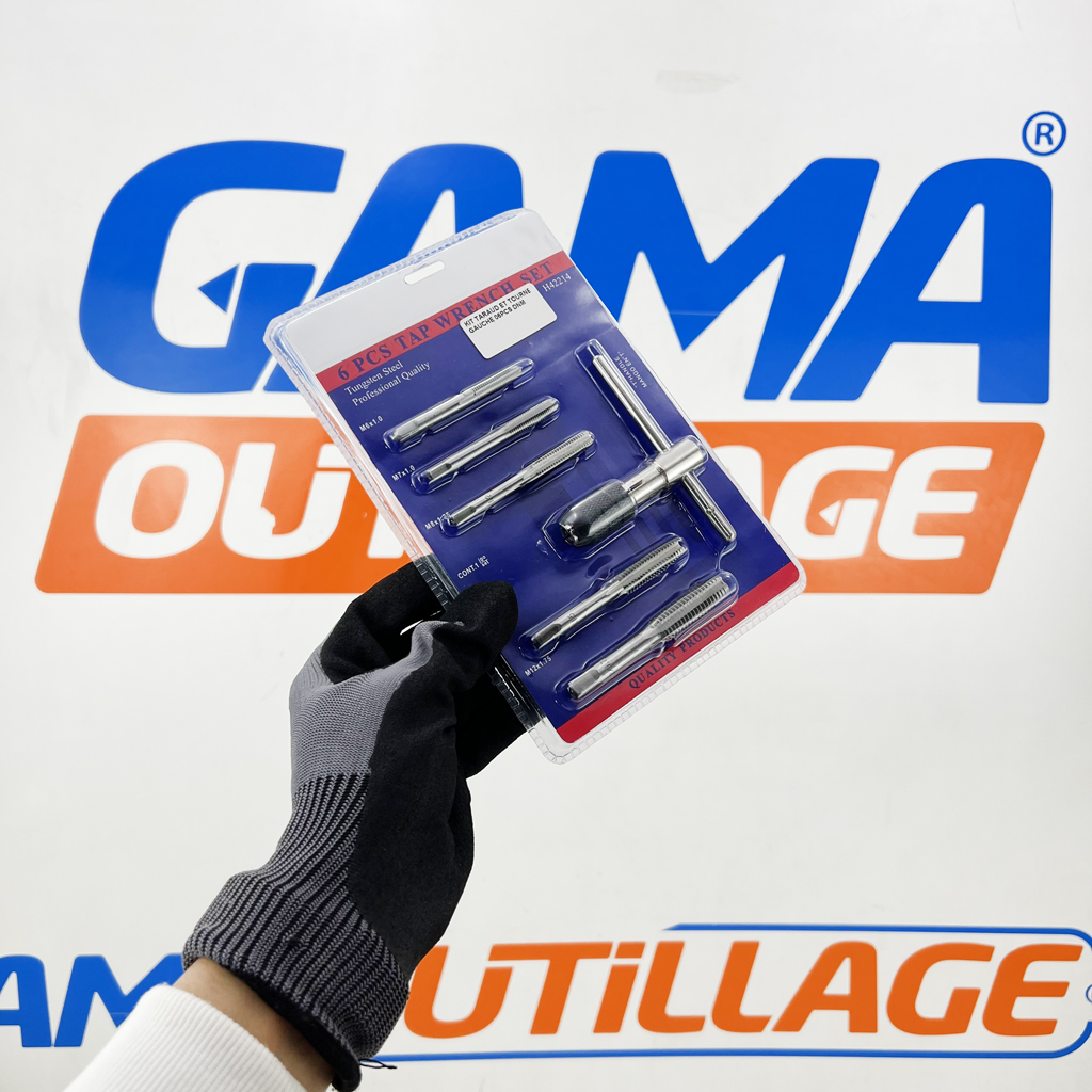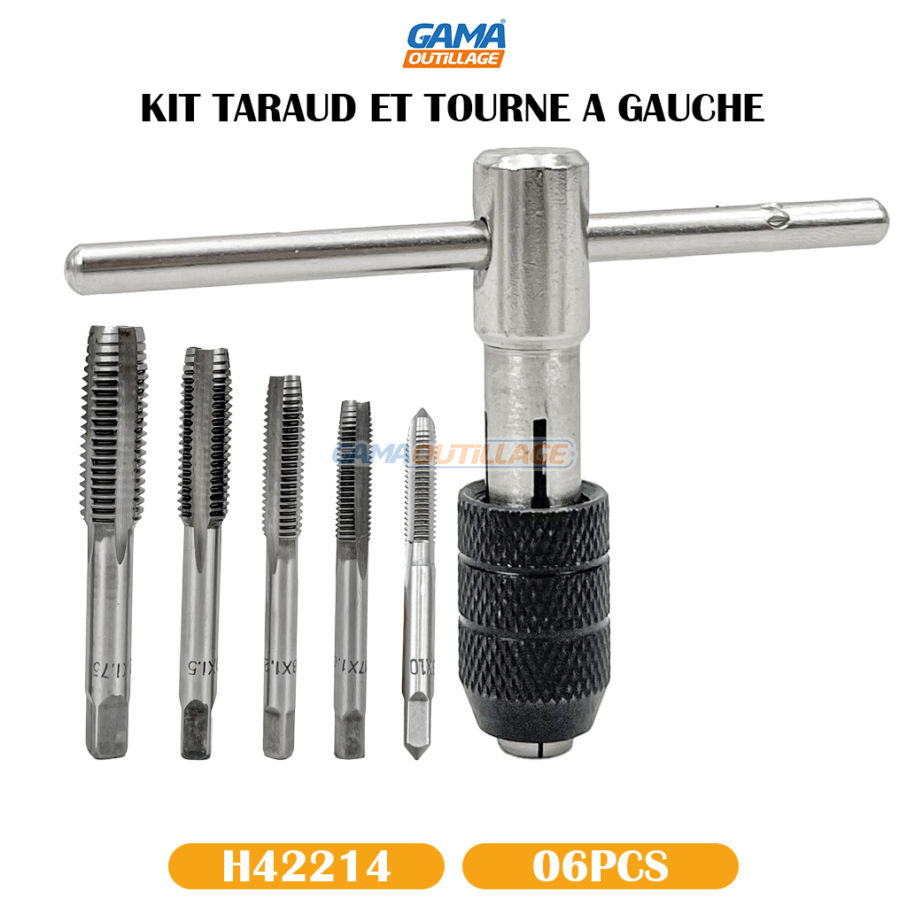 GAMAOUTILLAGE vous propose une KIT TARAUD ET TOURNE A GAUCHE 06PCS DNM, est un ensemble d’outils utilisés pour réaliser des filetages, c’est-à-dire créer des pas de vis dans des matériaux comme le méta.