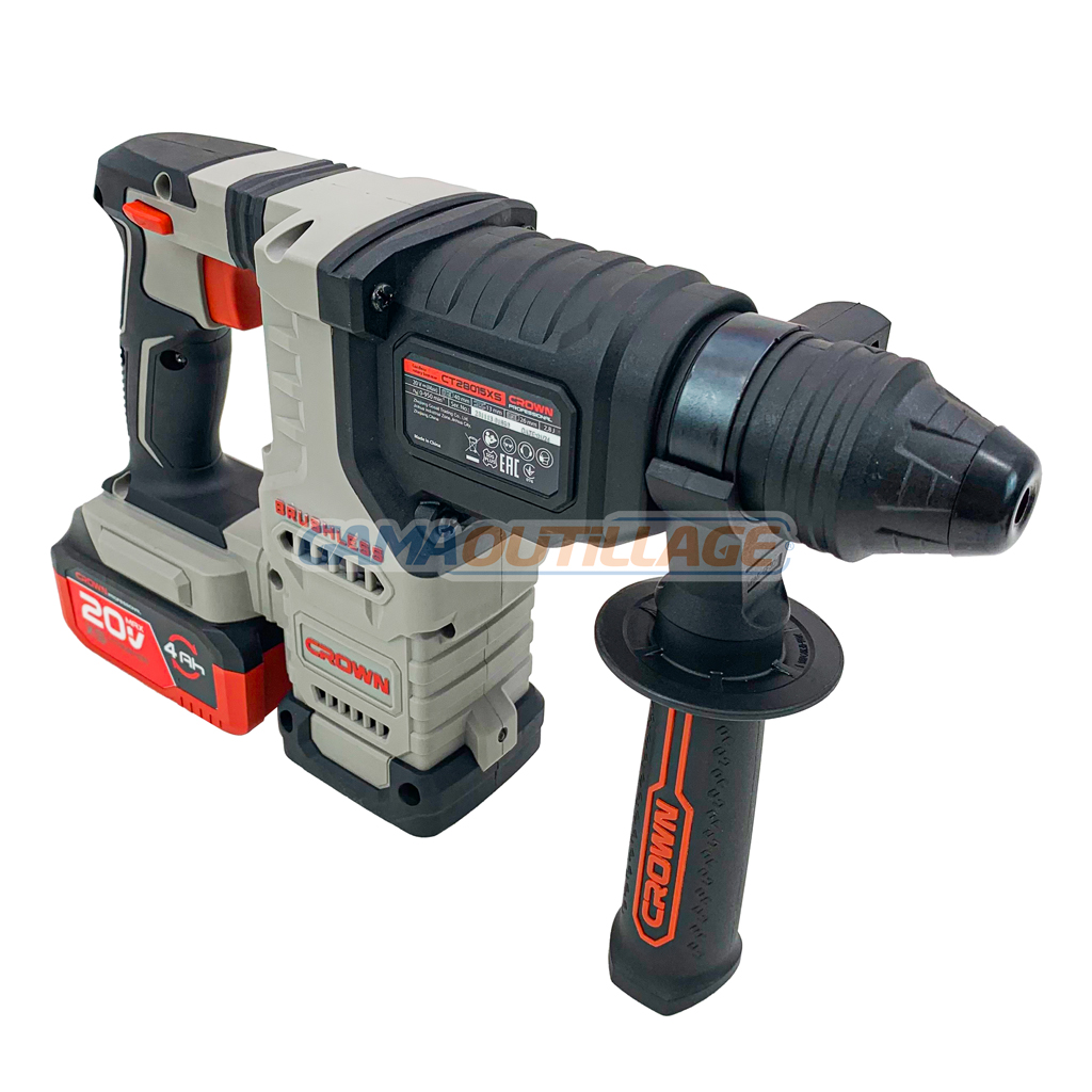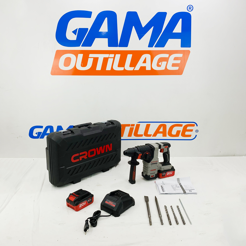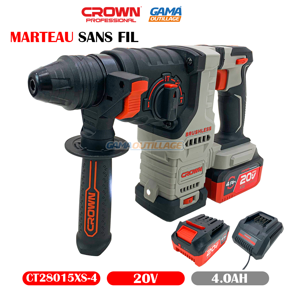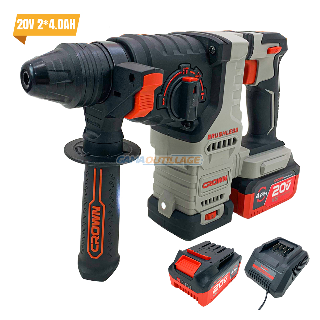 MARTEAU SANS FIL 20V 2*4.0AH CROWN, est un outil puissant et polyvalent qui est parfait pour une variété de tâches, y compris le perçage, le burinage et le cassage.