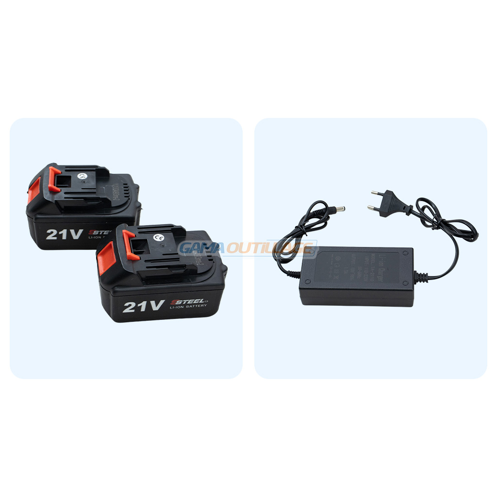 Livré en coffret rigide, le modèle 21HD-1 est fourni avec deux batteries 21V 4.0Ah et un chargeur, constituant un ensemble complet prêt à l’emploi.
