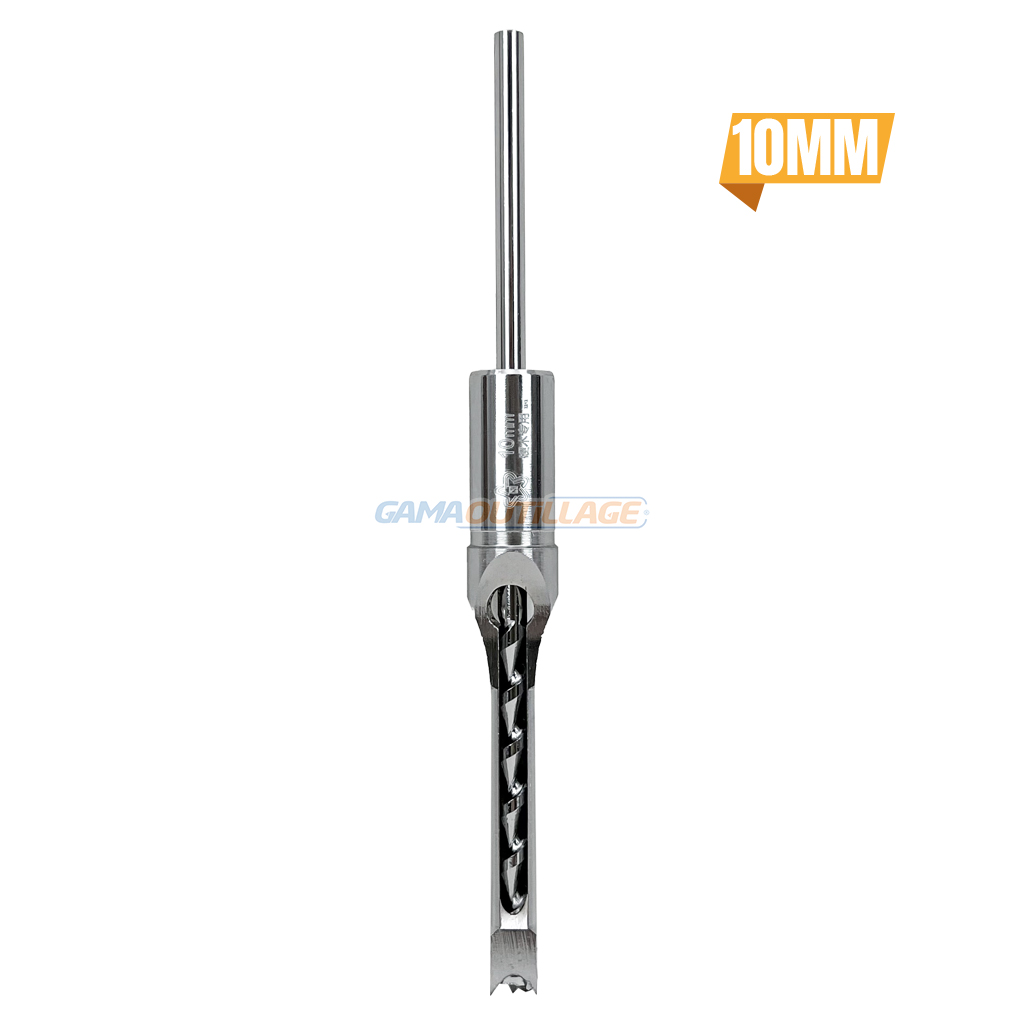 MECHE BEDANE 10MM, est un outil de perçage spécialisé, conçu pour réaliser des mortaises carrées dans le bois. Le diamètre de 10mm correspond à la dimension intérieure de la mortaise que vous créerez.