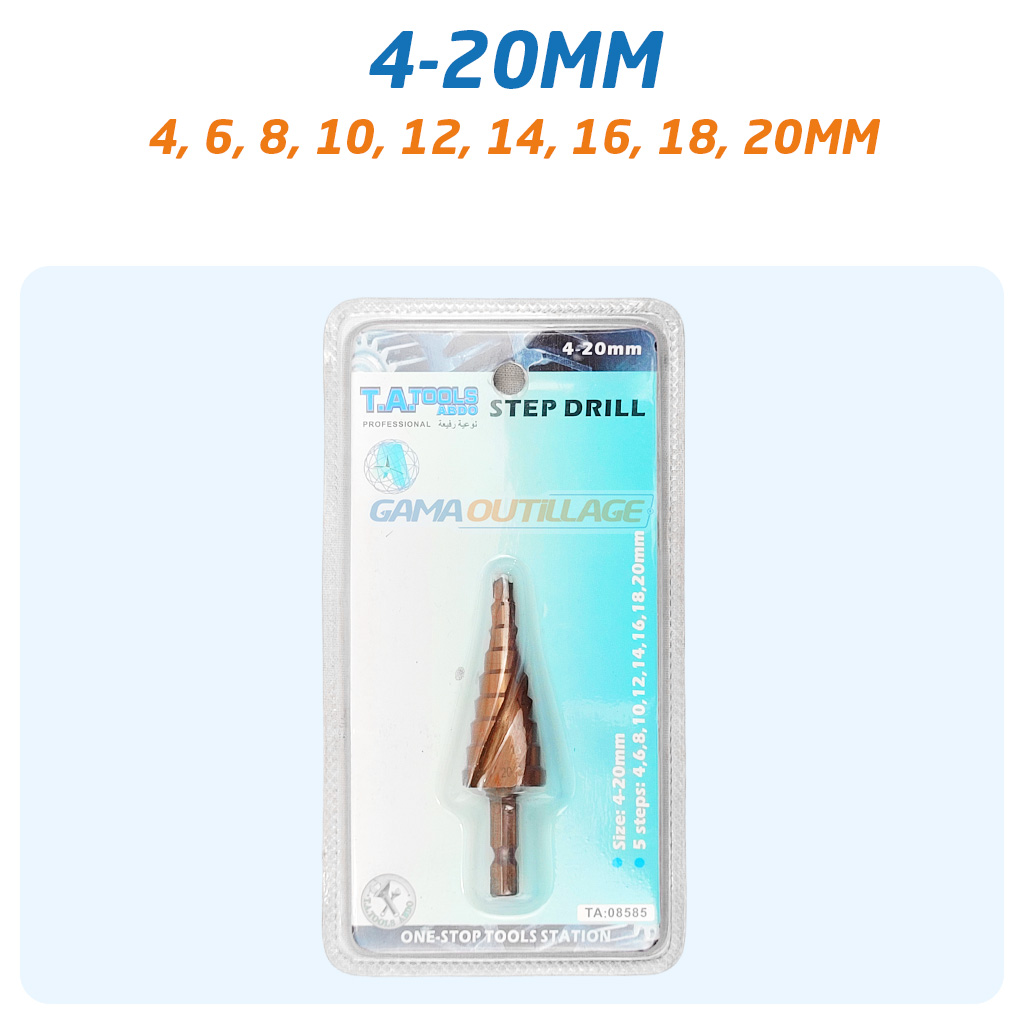 La mèche étagée TA 08585 est conçue pour un perçage progressif sans changement d’outil. Elle permet de réaliser des trous nets de 4 à 20 mm grâce à ses marches gravées directement sur le foret. Son embout hexagonal assure une bonne prise et une fixation sécurisée dans un porte-embout ou un mandrin de perceuse.