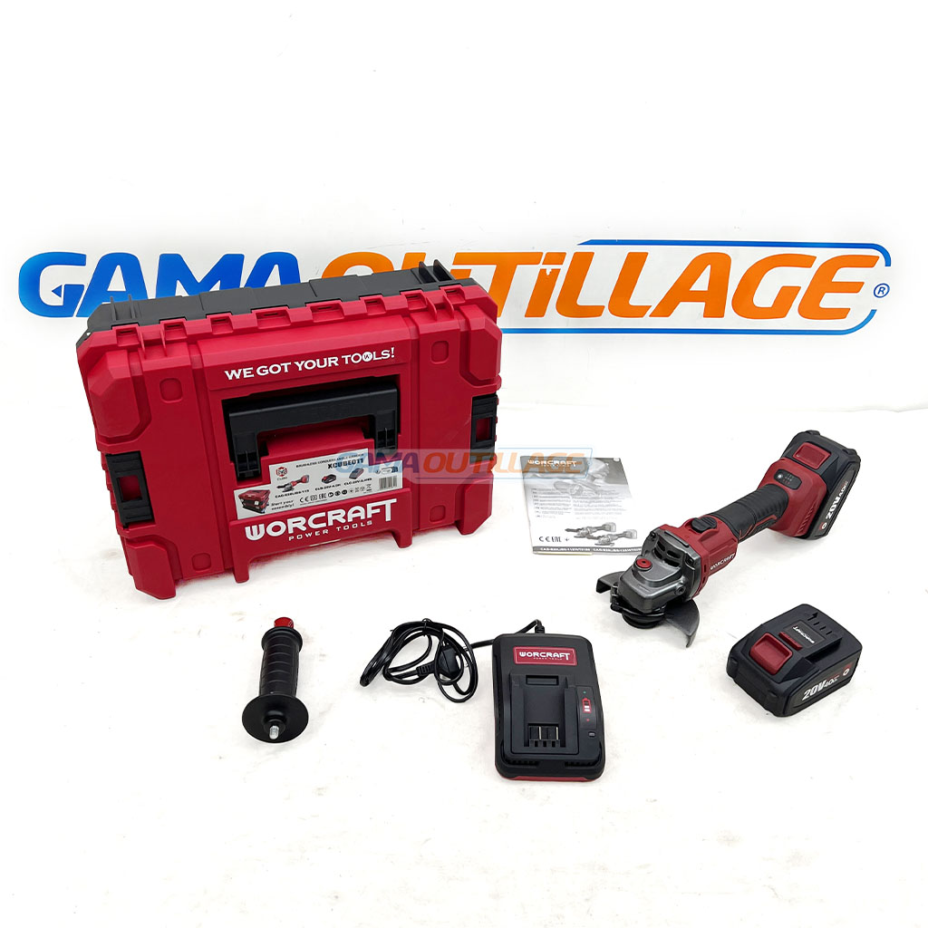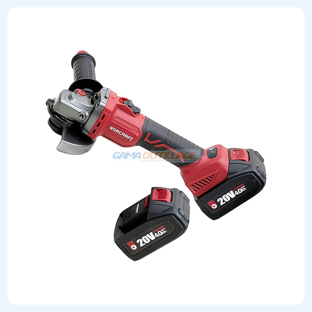 Meuleuse sans fil WORCRAFT 20V Brushless. Pack complet avec 2 batteries 4.0Ah + chargeur rapide. Pour découpe et meulage polyvalents. GAMA OUTILLAGE.