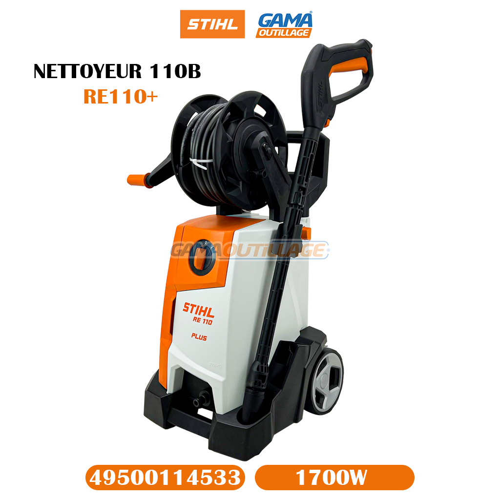 NETTOYEUR 110B 1700W RE110+ STIHL, est un nettoyeur haute pression conçu pour un usage domestique et semi-professionnel. Il est doté d’un moteur puissant de 1700 W et d’une pression de 110 bars