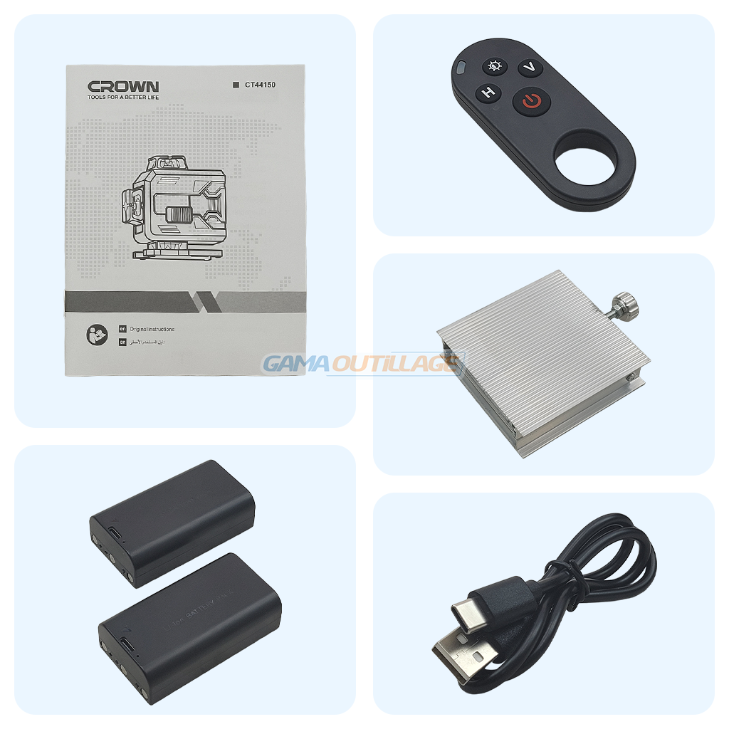 Le niveau laser CROWN CT44150 projette 4 lignes à 360° (2 horizontales + 2 verticales) permettant un alignement complet et précis pour tous vos travaux d’aménagement, de maçonnerie et de second œuvre. Grâce à sa portée de 30 mètres et sa précision de ±2 mm à 5 m, il assure un traçage fiable en intérieur comme en extérieur.