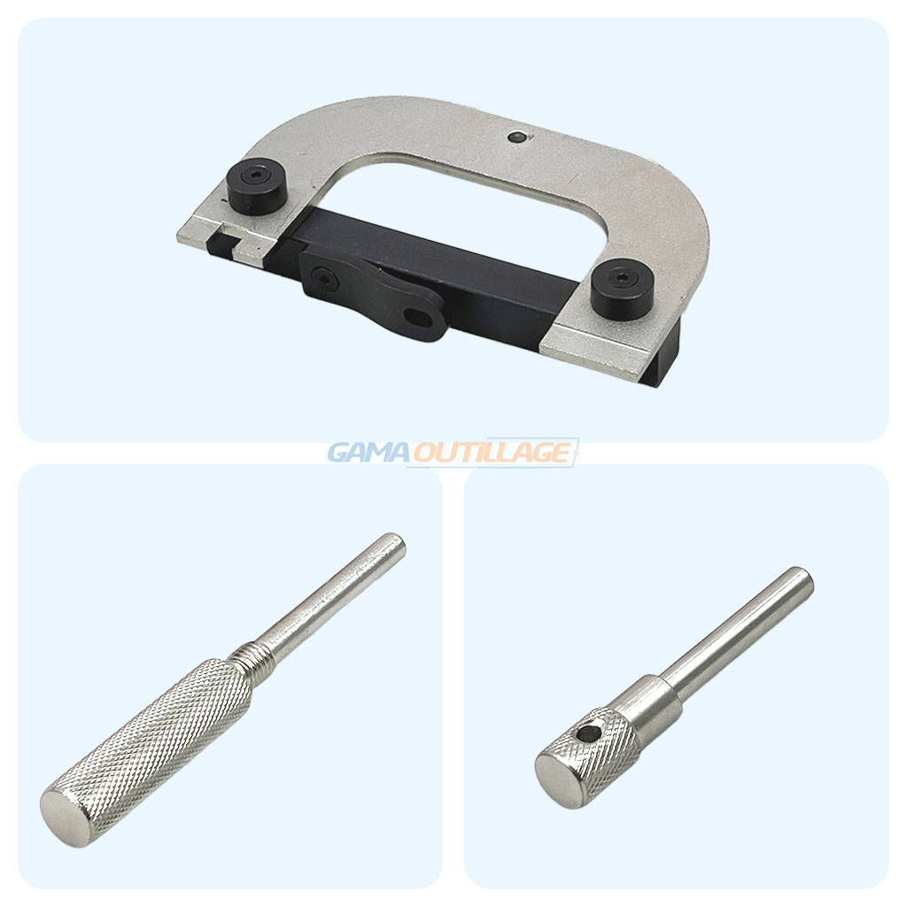 Cet outil de calage moteur Renault 16V (3 pièces) est conçu pour bloquer et aligner correctement les arbres à cames lors des opérations de remplacement ou de réglage de la courroie de distribution.