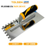PLATOIR EN INOX DENTE 10*10 TOLSEN, un outil essentiel pour les travaux de plâtrage. Elle se distingue d’une truelle lisse par sa lame métallique munie de dents ou de crans, généralement en acier inoxydable.