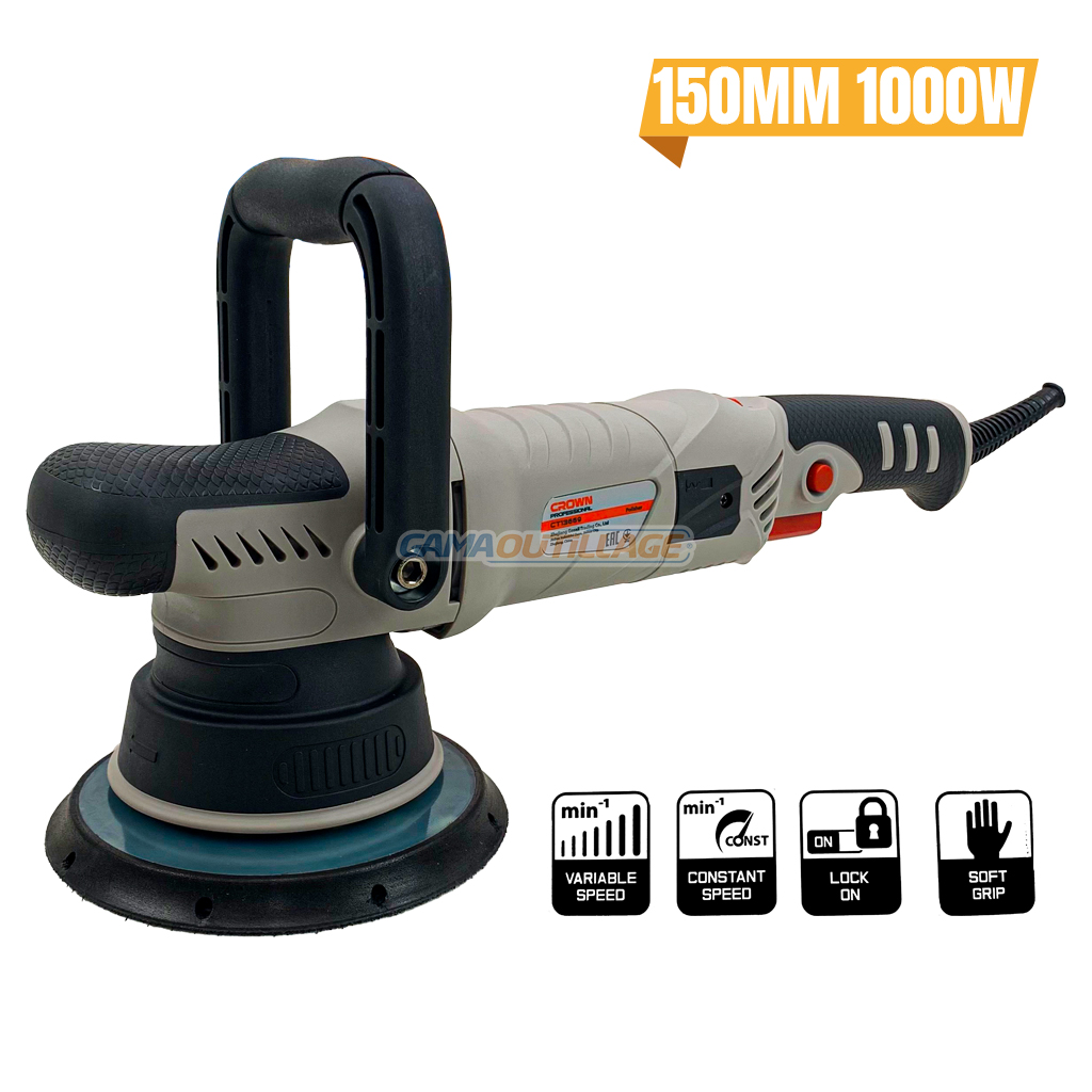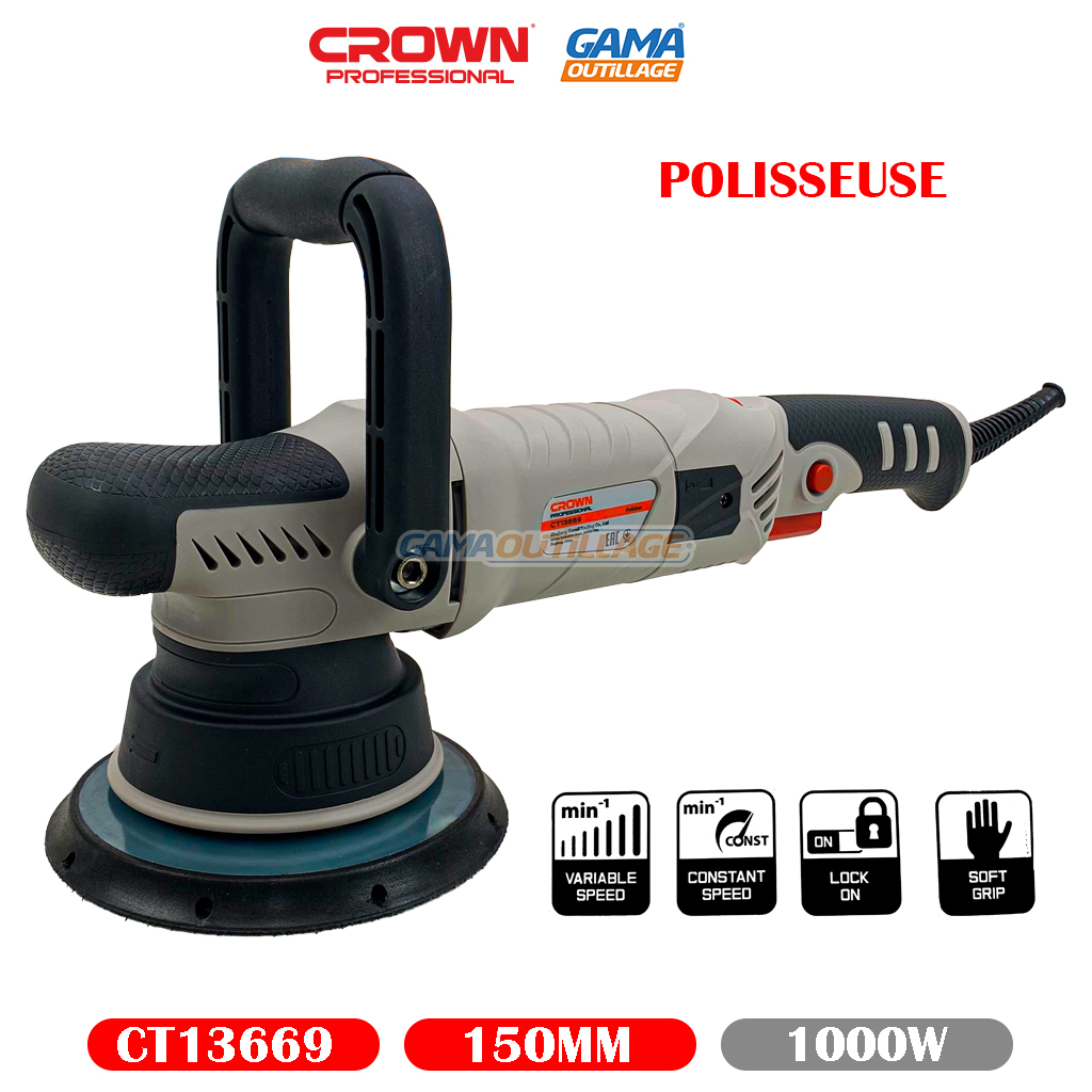 POLISSEUSE 150MM 1000W CROWN, est un outil électrique conçu pour polir, lustrer et restaurer diverses surfaces, notamment les carrosseries de voitures, les meubles en bois et les métaux.