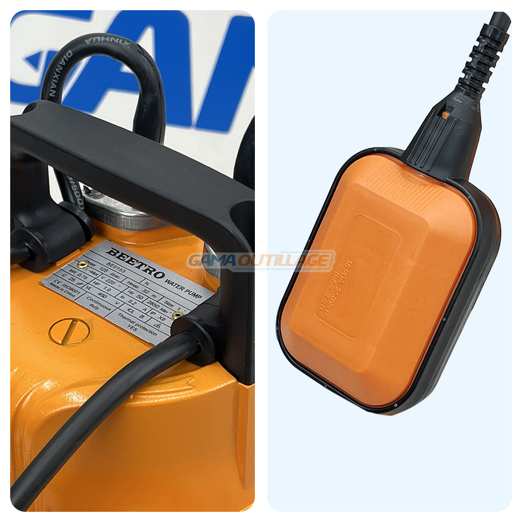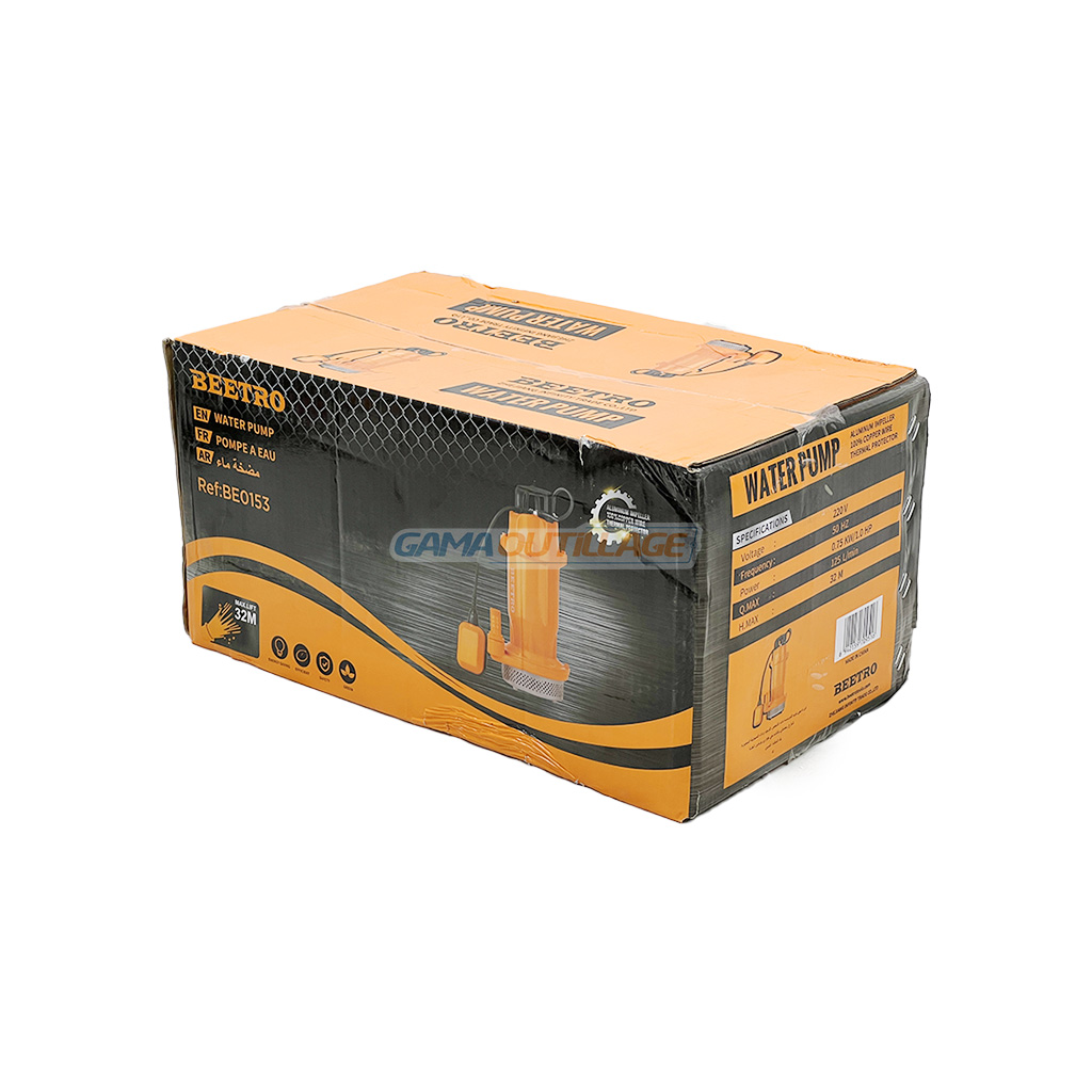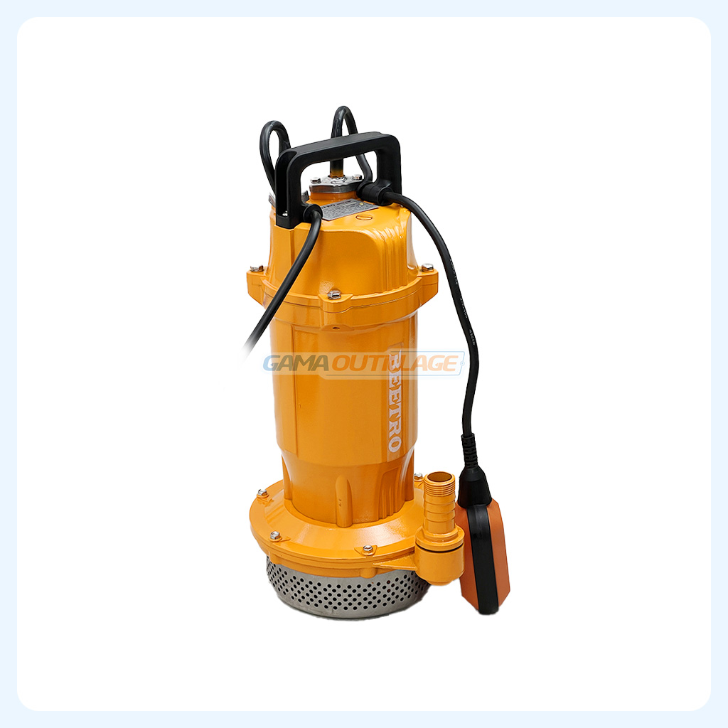 Pompe à eau submersible BEETRO BE0153, 750W (1.0HP), 125L/min, hauteur 32m. Corps aluminium robuste avec flotteur automatique. Idéale puits, irrigation, drainage.