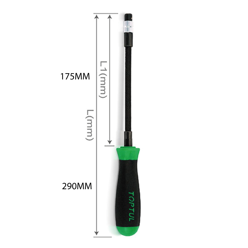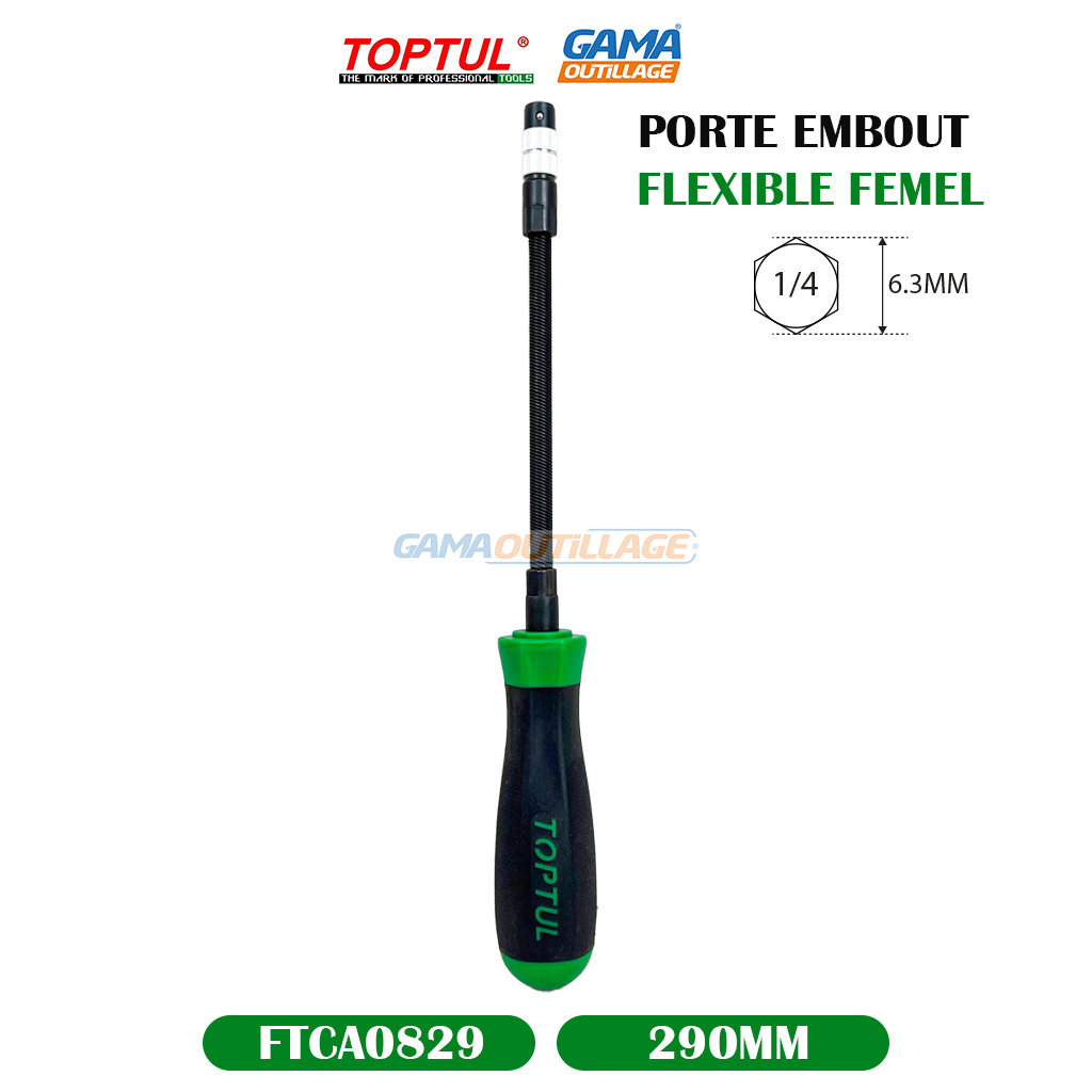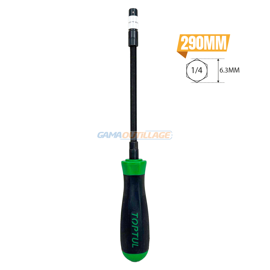 PORTE EMBOUT FLEXIBLE 1/4 FEMEL TOPTUL, C’est un outil manuel qui permet d’utiliser des embouts de vissage ou de perçage dans des endroits difficiles d’accès. Grâce à sa tige flexible, il peut être plié et orienté dans toutes les directions, facilitant ainsi les travaux dans les espaces restreints. La poignée offre une prise en main confortable et un meilleur contrôle lors de son utilisation.