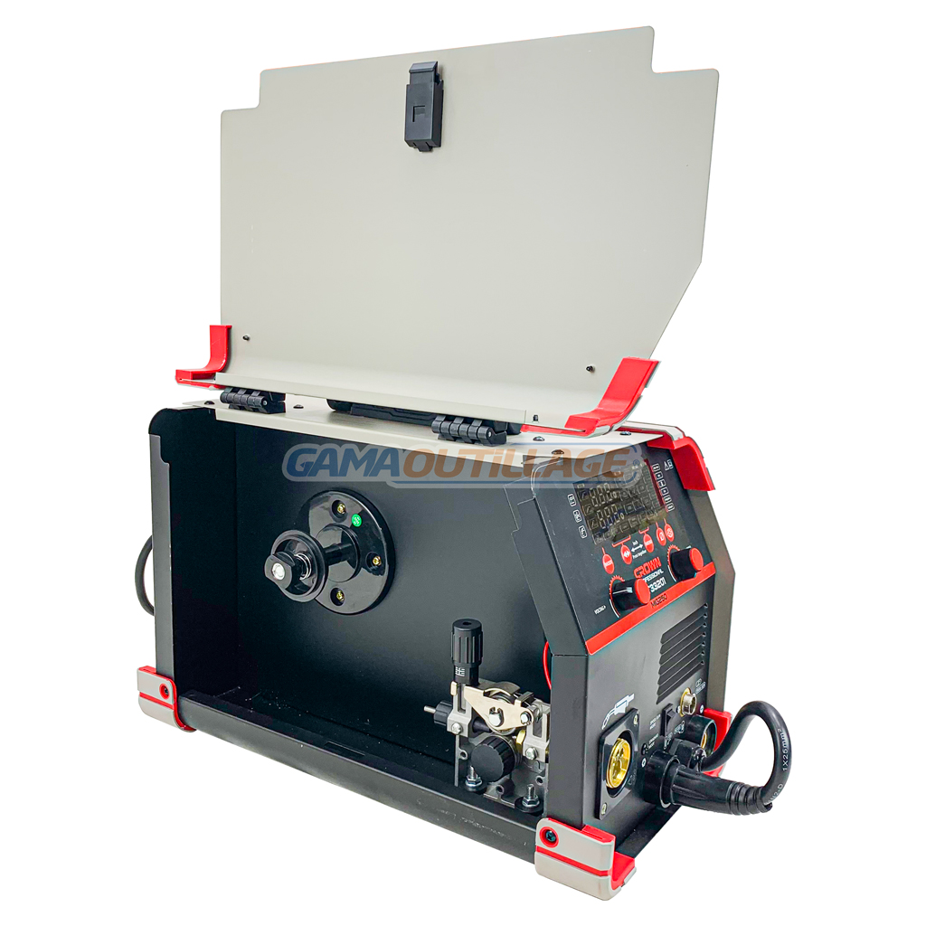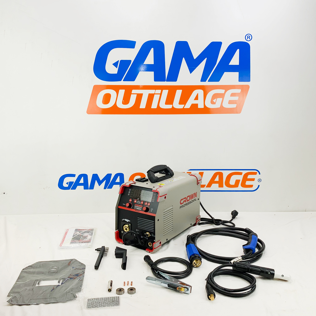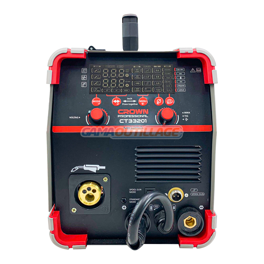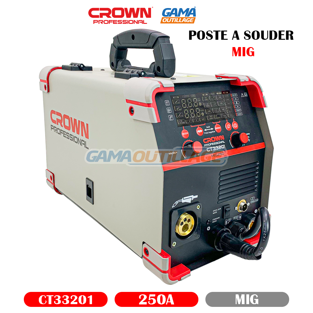 GAMAOUTILLAGE vous propose une POSTE A SOUDER MIG250 CROWN, est un équipement électrique conçu pour réaliser des soudures par le procédé MIG (Metal Inert Gas). Il utilise un arc électrique entre une électrode en fil continu et la pièce à travailler, sous une protection gazeuse inerte (souvent de l’argon ou un mélange d’argon et de CO2).