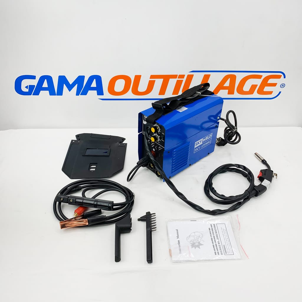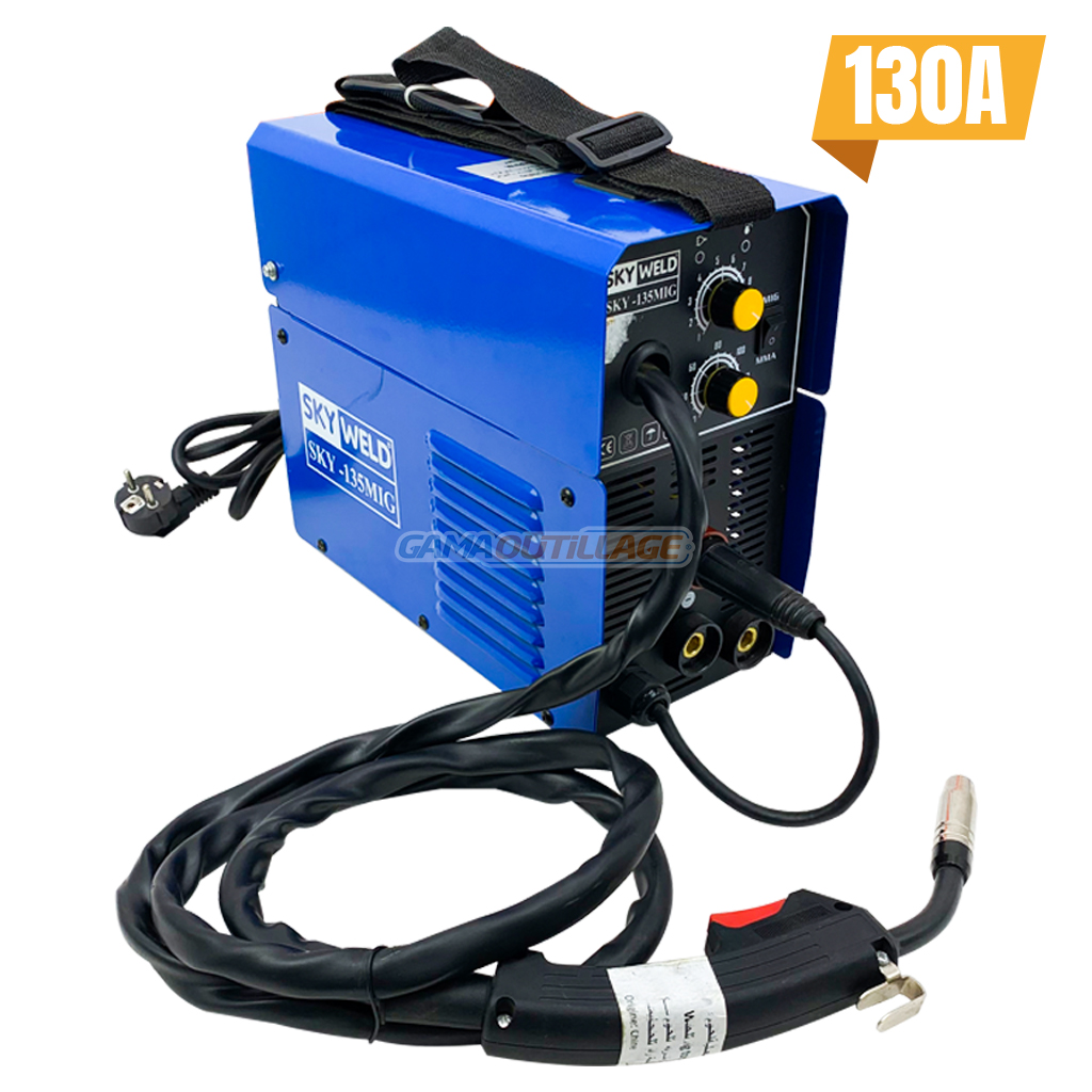 GAMAOUTILLAGE vous propose une POSTE A SOUDER MIG 130A SKYWELD, plus torche mig incluse consommables torche mig disponibles, le poste à souder MIG 130A est un poste à souder monophasé qui offre une puissance de 4,8 kVA et un courant de soudage de 130 A. Il est idéal pour les travaux de soudage légers, tels que le soudage de tôles fines en acier ou inox. Le poste à souder MIG 130A est également équipé d’un pistolet MIG, et d’un masque de soudage.