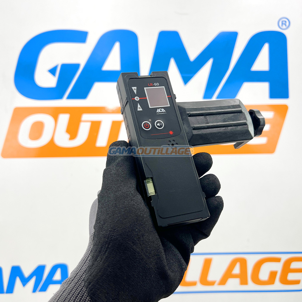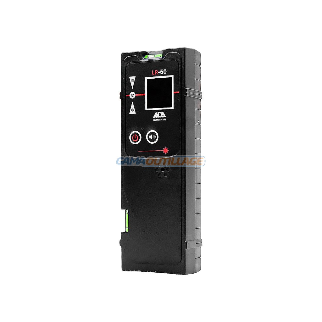 Récepteur laser ADA LR-60 avec viseur à bulle, écran clair et support pour mire. Détection précise du faisceau laser sur chantier.