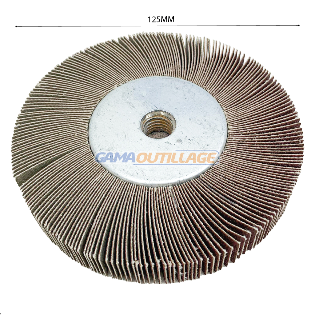 GAMAOUTILLAGE vous propose une ROUE A LAMELLE 125*20*M14 P240, est un outil abrasif utilisé pour le ponçage et l’ébavurage des métaux. Elle est composée de nombreuses lamelles abrasives en zirconium montées sur un support central en fibre de verre. Le grain 240 correspond à une grosseur moyenne, ce qui la rend idéale pour le ponçage grossier et l’enlèvement de matière.