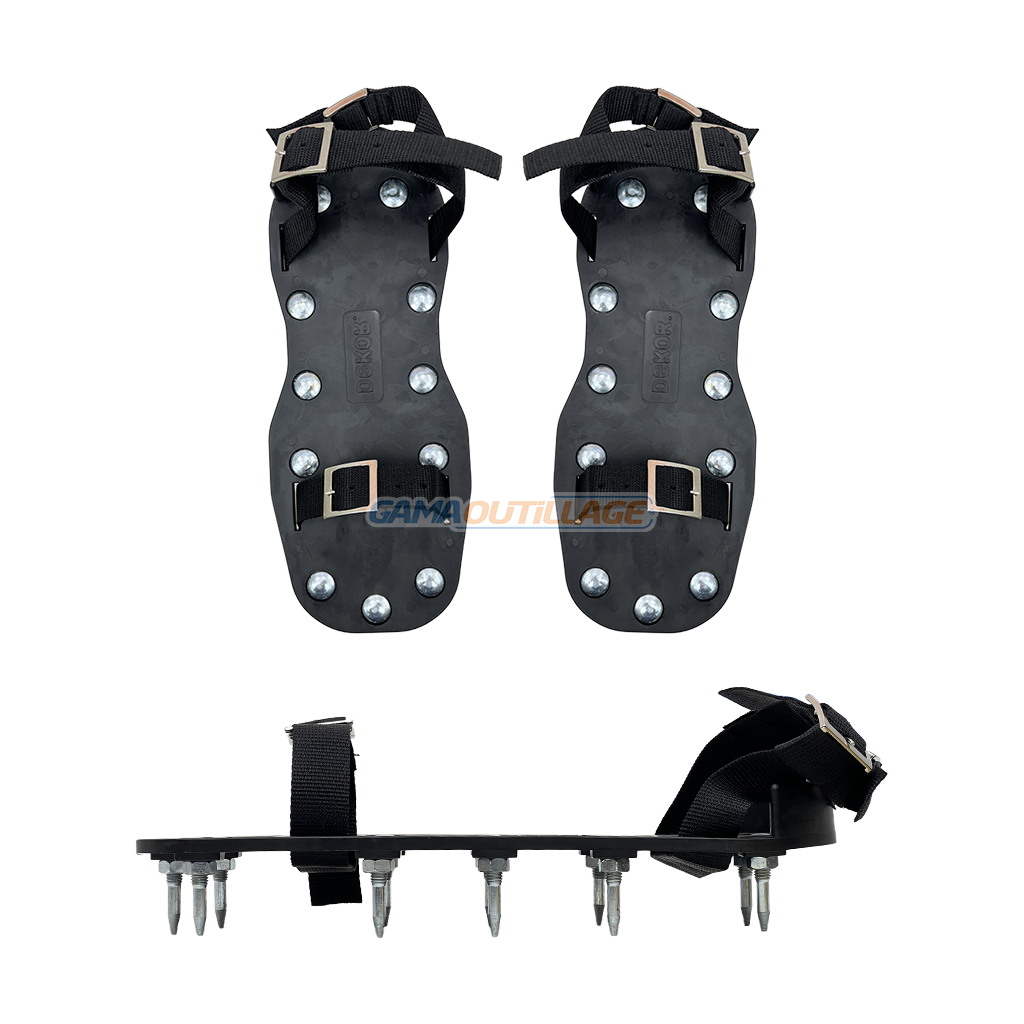 Sandales clouées DEKOR avec 13 pointes époxy, semelle rigide et double sangle. Idéales pour sols frais, béton ou enduits. Disponible chez GAMA OUTILLAGE.