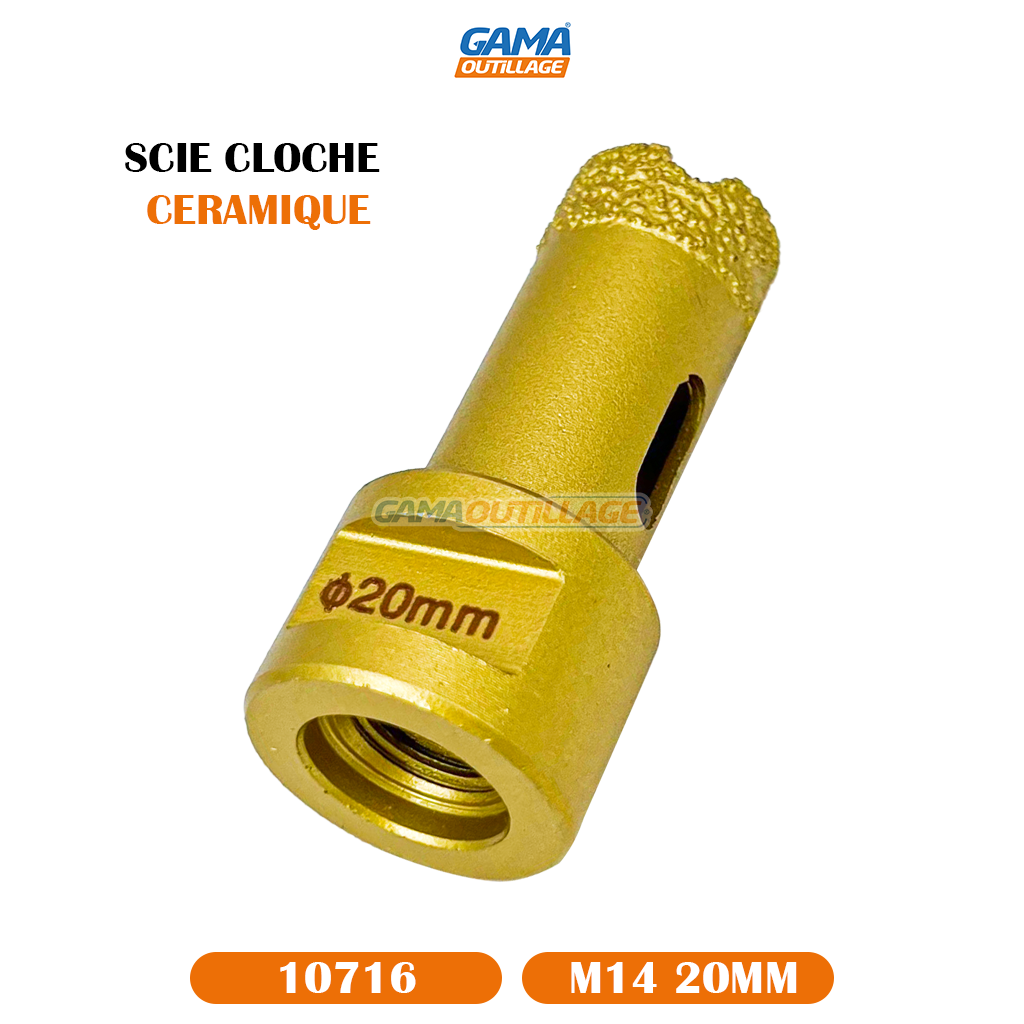 GAMAOUTILLAGE vous propose une SCIE CLOCHE CERAMIQUE M14 20MM TA, est un outil de coupe spécialisé, conçu pour percer des trous de grand diamètre dans des matériaux durs comme la céramique, le carrelage et le granit.