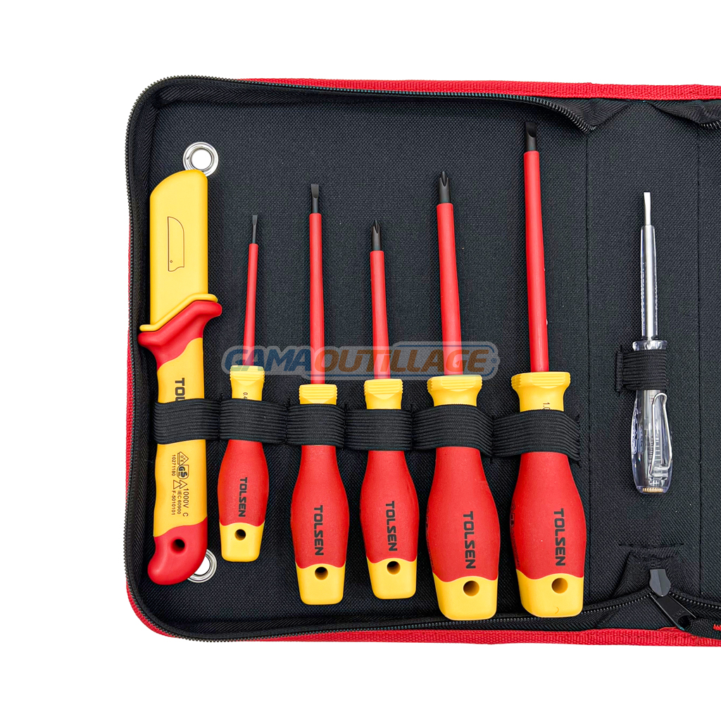 GAMAOUTILLAGE vous propose une SELECTION DE 11 OUTILS ELECTRICIEN ISOLEE TOLSEN, est un kit essentiel pour les électriciens et toute personne travaillant sur des installations électriques sous tension. L’isolation protège l’utilisateur contre les chocs électriques, assurant une sécurité maximale.