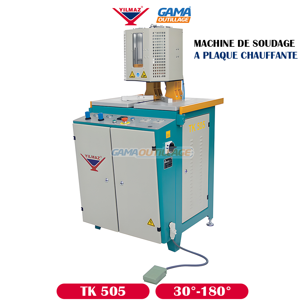 GAMAOUTILLAGE vous propose une MACHINE DE SOUDAGE A PLAQUE CHAUFFANTE TK 505 YILMAZ, Cette machine est idéale pour le soudage d’angle simple de profilés en PVC entre 30° et 180°, Réglage manuel des options de soudage standard (2 mm) ou sans soudure (0,2 mm), Réglage automatique des options de soudage standard (2 mm) ou sans soudure (0,2 mm).