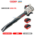 GAMAOUTILLAGE vous propose une SOUFLEUR S/FIL 20V 2*4.0AH CROWN, est un outil de nettoyage portatif conçu pour faciliter l’élimination des feuilles mortes, des débris et de la poussière. Il offre une solution pratique et efficace pour l’entretien des jardins, des terrasses, des ateliers et d’autres espaces extérieurs.