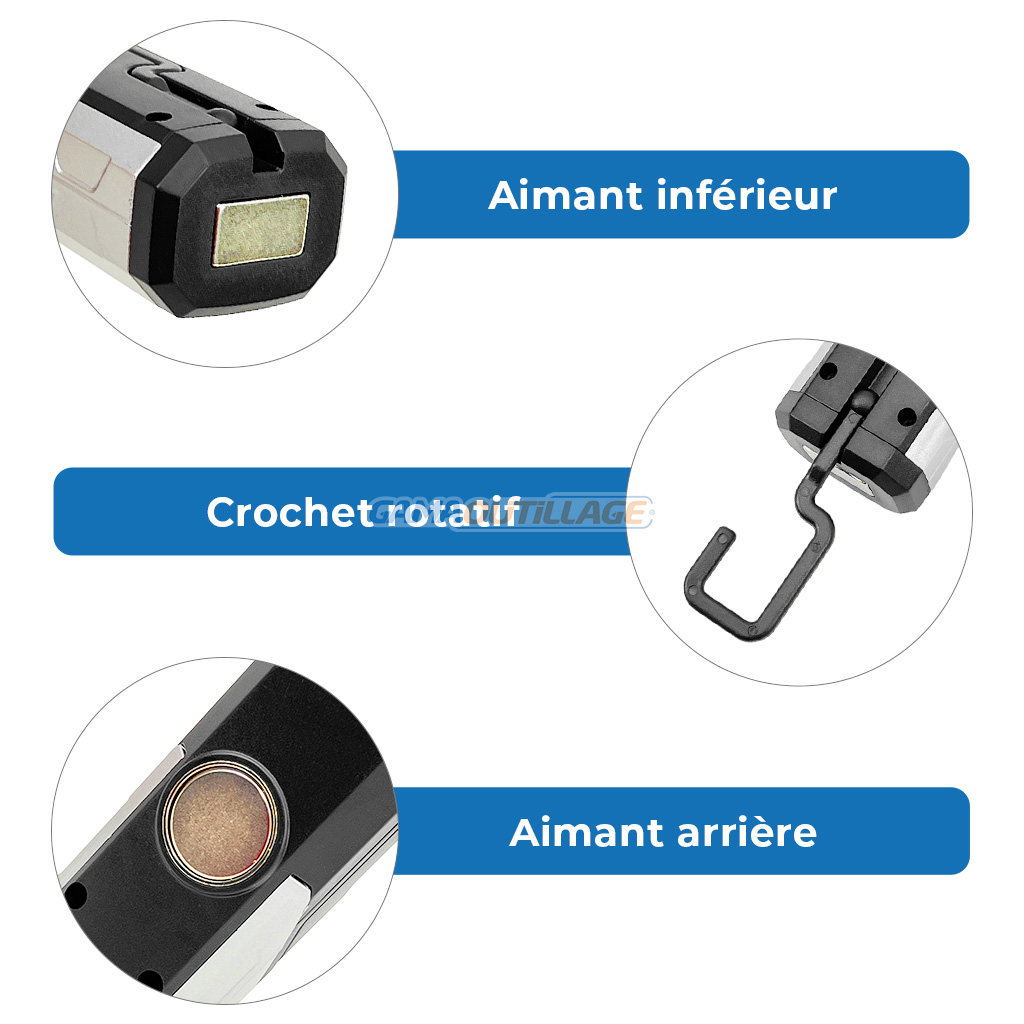 Fixation : Aimants (inférieur + arrière) et crochet rotatif