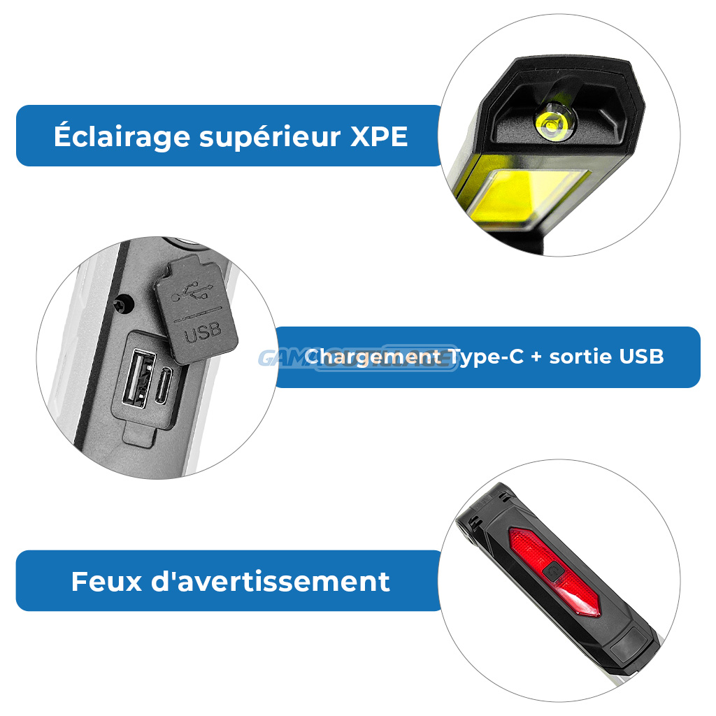 Mode d’éclairage : Principal COB, lampe XPE, feu arrière