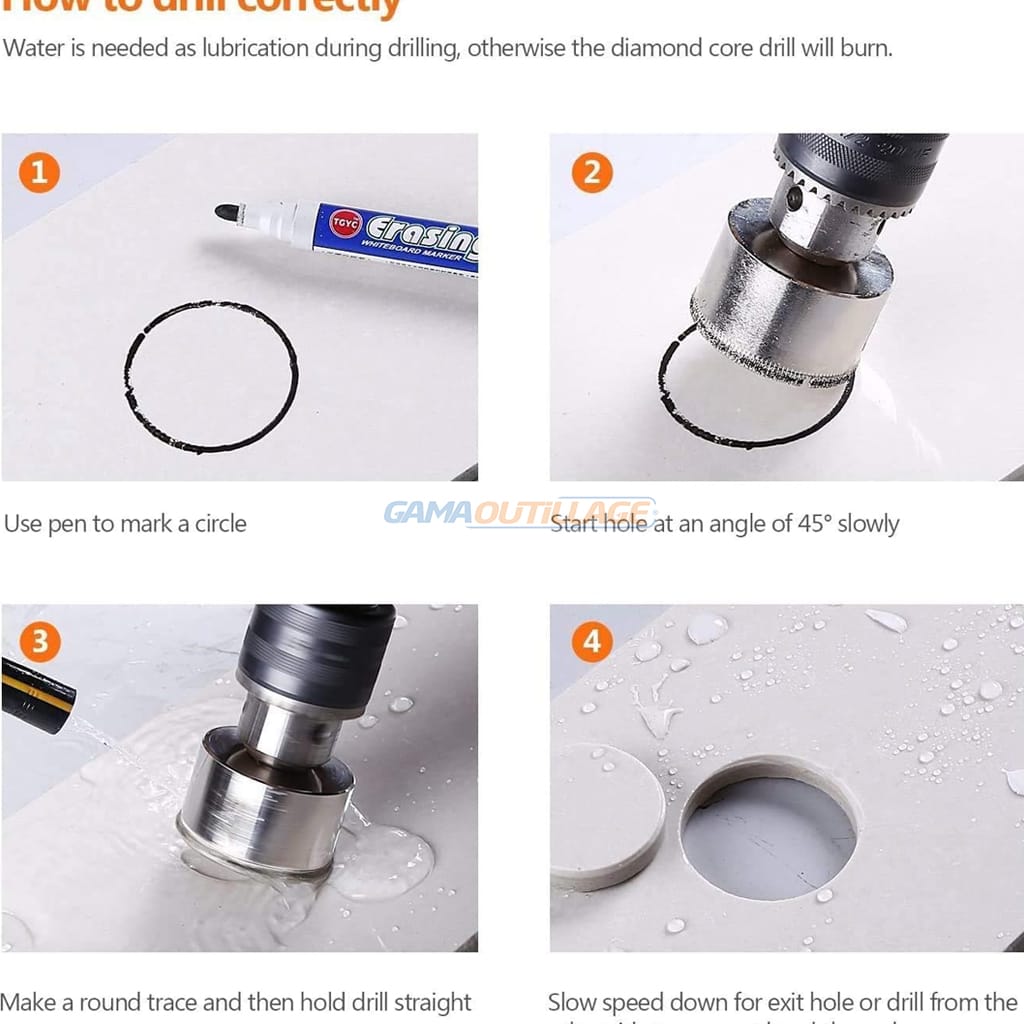 GAMAOUTILLAGE vous propose un TREPAND CERAMIQUE A EAU TA, cette trépan à eau est un outil de perçage utilisé pour percer des trous dans des matériaux durs, tels que la céramique, le verre et le marbre. Il est composé d’un corps en métal et d’une pointe en diamant ou en carbure de tungstène.