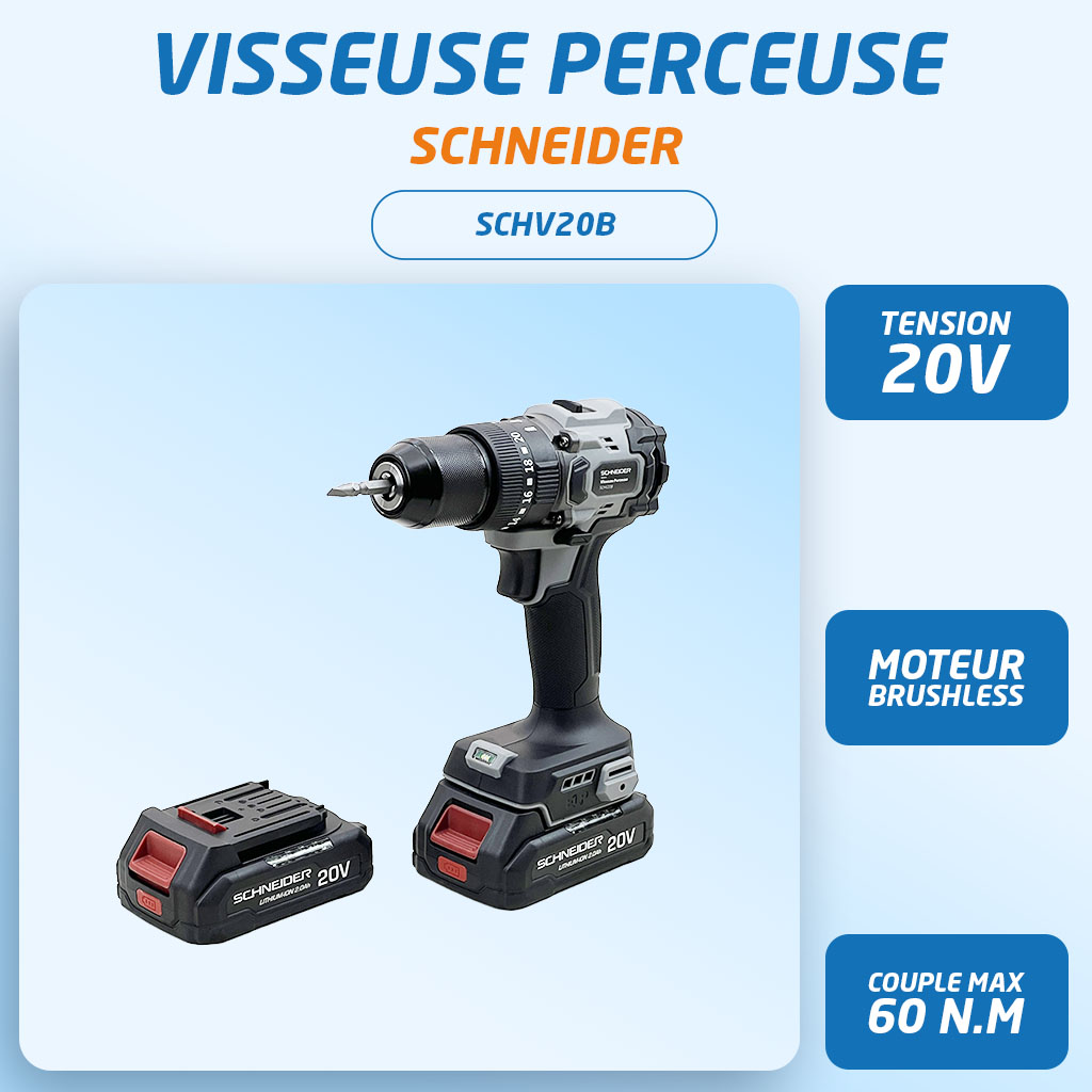 Visseuse Perceuse Schneider 20V – Brushless, 2 Batteries 2.0Ah, Couple 60Nm